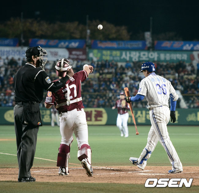 4일 오후 대구야구장에서 열린 2014 한국야쿠르트 세븐 프로야구 포스트시즌 한국시리즈 1차전, 7회말 1사에서 삼성 이승엽이 삼진으로 물러나고 있다.