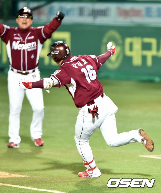 4일 오후 대구야구장에서 열린 2014 한국야쿠르트 세븐 프로야구 포스트시즌 한국시리즈 1차전, 경기, 8회초 무사 1루 강정호가 투런 홈런을 치고 환호하고 있다.