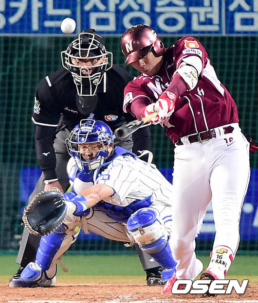 8회초 넥센 공격 무사 1루 상황 강정호가 달아나는 좌중간 투런포를 날리고 있다.