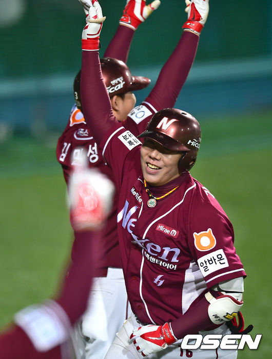4일 오후 대구구장에서 열린 '2014 한국야쿠르트 세븐 프로야구' 한국시리즈 1차전 삼성 라이온즈와 넥센 히어로즈의 경기, 8회초 무사 1루 넥센 강정호가 2점 홈런을 날리고 환호하고 있다.