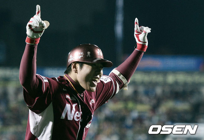 4일 오후 대구야구장에서 열린 2014 한국야쿠르트 세븐 프로야구 포스트시즌 한국시리즈 1차전, 8회초 무사 1루에서 넥센 강정호가 투런포를 날리고 기뻐하고 있다.