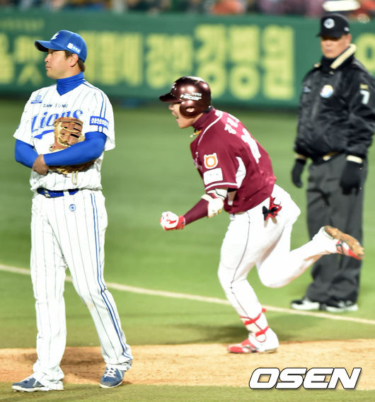 4일 오후 대구야구장에서 열린 2014 한국야쿠르트 세븐 프로야구 포스트시즌 한국시리즈 1차전, 경기, 8회초 무사 1루 강정호가 투런 홈런을 치고 환호하고 있다.