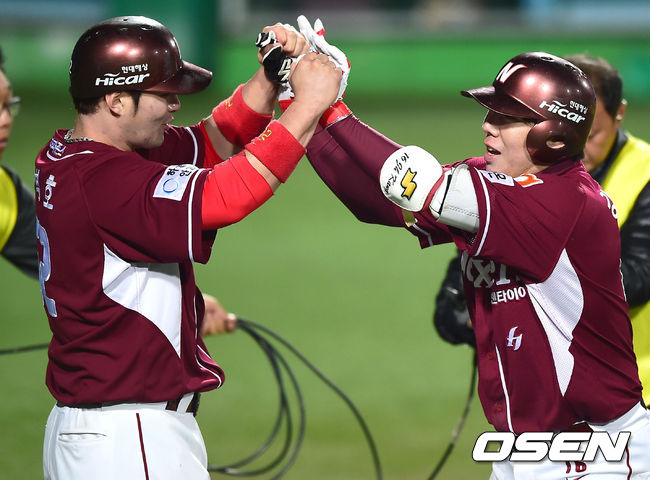 4일 오후 대구구장에서 열린 '2014 한국야쿠르트 세븐 프로야구' 한국시리즈 1차전 삼성 라이온즈와 넥센 히어로즈의 경기, 8회초 무사 1루 넥센 강정호가 2점 홈런을 날리고 환호하고 있다.