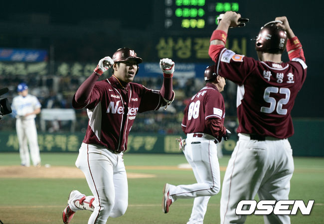 4일 오후 대구야구장에서 열린 2014 한국야쿠르트 세븐 프로야구 포스트시즌 한국시리즈 1차전, 8회초 무사 1루에서 넥센 강정호가 투런포를 날리고 기뻐하고 있다.