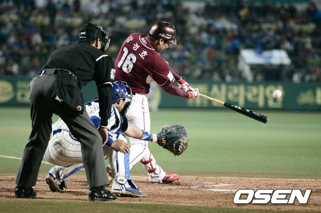 4일 오후 대구야구장에서 열린 2014 한국야쿠르트 세븐 프로야구 포스트시즌 한국시리즈 1차전, 8회초 무사 1루에서 넥센 강정호가 투런포를 날리고 있다.