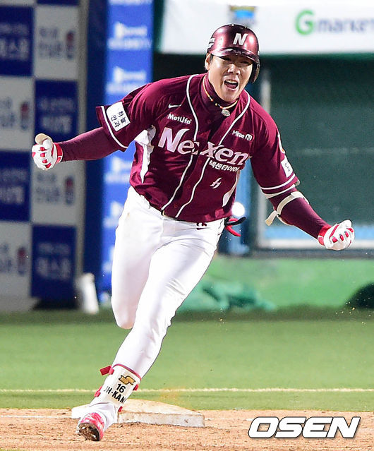 8회초 넥센 공격 무사 1루 상황 강정호가 달아나는 좌중간 투런포를 날리고 주먹을 불끈 쥐며 그라운드를 돌고 있다.