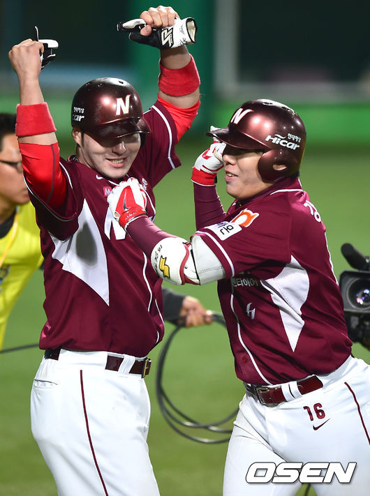 4일 오후 대구구장에서 열린 '2014 한국야쿠르트 세븐 프로야구' 한국시리즈 1차전 삼성 라이온즈와 넥센 히어로즈의 경기, 8회초 무사 1루 넥센 강정호가 2점 홈런을 날리고 박병호와 기뻐하고 있다.