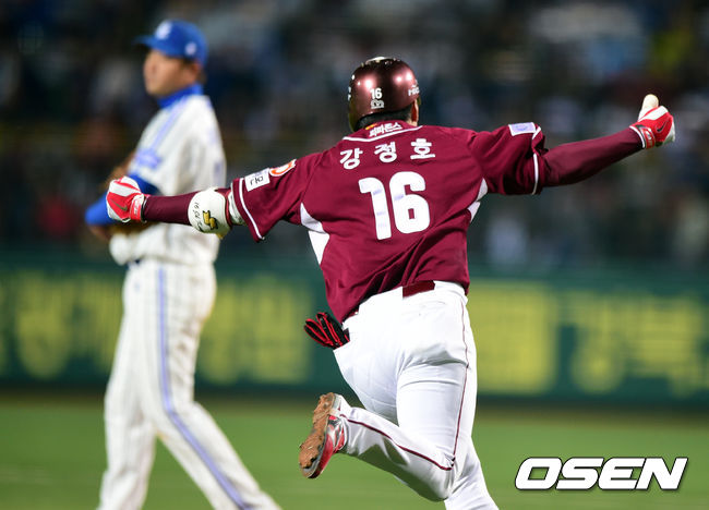 4일 오후 대구야구장에서 열린 2014 한국야쿠르트 세븐 프로야구 포스트시즌 한국시리즈 1차전, 8회초 무사 1루에서 넥센 강정호가 투런포를 날리고 기뻐하고 있다.