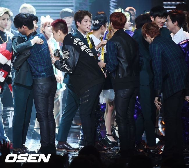 빅스가 더 쇼에서 1위를 차지한 후 2AM의 축하를 받고 있다.
