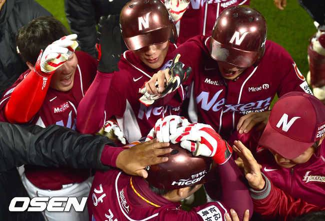 4일 오후 대구구장에서 열린 '2014 한국야쿠르트 세븐 프로야구' 한국시리즈 1차전 삼성 라이온즈와 넥센 히어로즈의 경기, 8회초 무사 1루 넥센 강정호가 2점 홈런을 날리고 동료들의 축하를 받고 있다.