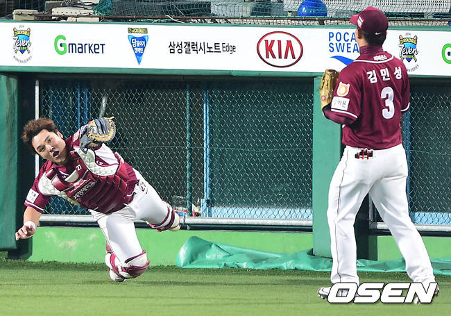 8회말 삼성 공격 선두타자로 나선 대타 우동균의 파울 타구를 넥센 포수 박동원이 넘어지며 잡아내고 있다.