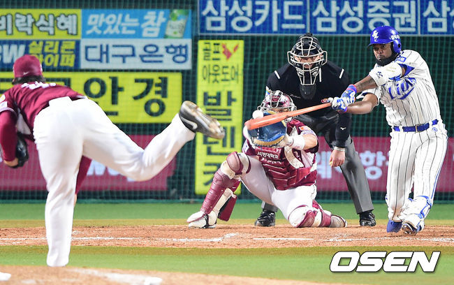 8회말 삼성 공격 2사 주자없는 상황 나바로가 넥센 투수 조상우의 공에 헛스윙 삼진아웃을 당하고 있다.