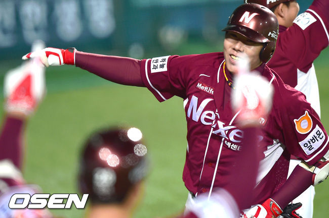 4일 오후 대구구장에서 열린 '2014 한국야쿠르트 세븐 프로야구' 한국시리즈 1차전 삼성 라이온즈와 넥센 히어로즈의 경기, 8회초 무사 1루 넥센 강정호가 2점 홈런을 날리고 베이스를 돌고 있다.