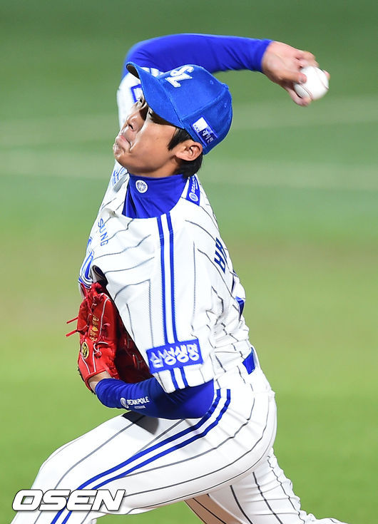 4일 오후 대구구장에서 열린 '2014 한국야쿠르트 세븐 프로야구' 한국시리즈 1차전 삼성 라이온즈와 넥센 히어로즈의 경기, 9회초 삼성 배영수 투수가 역투하고 있다