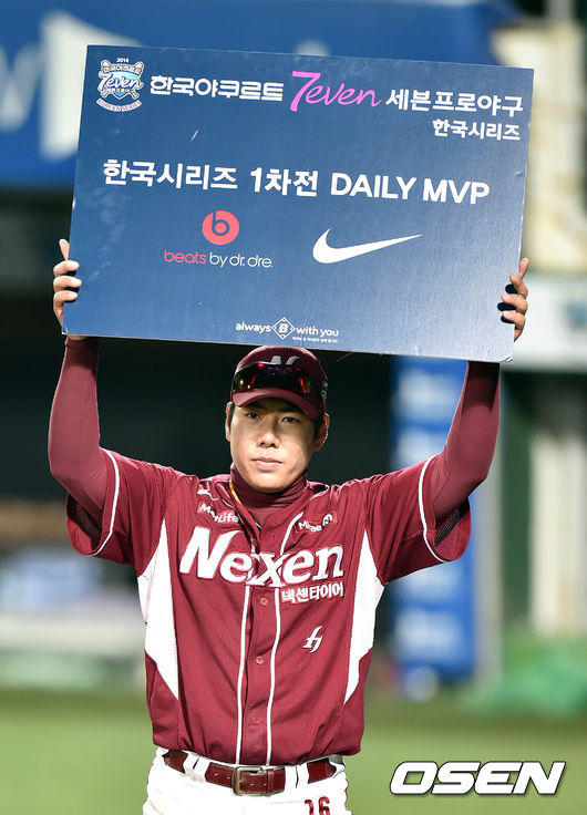 포스트시즌 들어 뜨거운 타격감을 이어가고 있는 강정호(27, 넥센)가 한국시리즈 1차전 최우수선수(MVP)에 선정됐다.