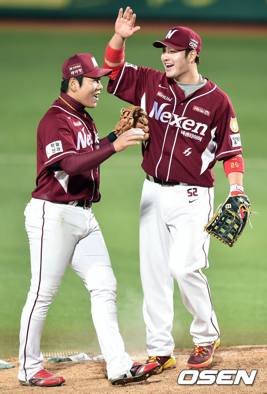 한국시리즈 첫 승을 거둔 강정호와 박병호가 기쁨을 나누고 있다./spjj@osen.co.kr