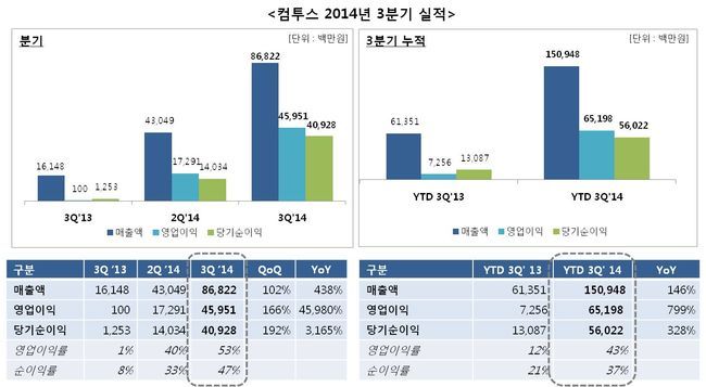 컴투스는 2014년 3분기 매출 868억 원, 영업이익 460억 원, 당기순이익 409억 원으로 역대 최대 분기 실적을 기록했다고 5일 밝혔다.