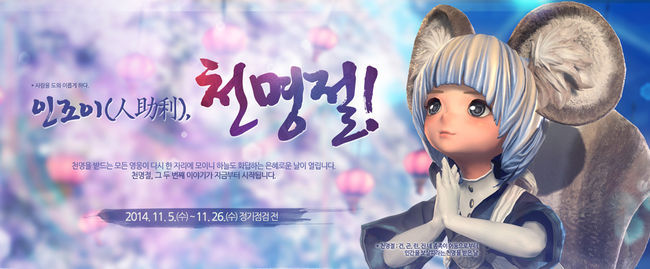 천명절(天命節)은 블소 최대 명절이다. 게임에 등장하는 4개 종족(건, 곤, 린, 진)이 어둠으로부터 인간을 보살피라는 천명을 받은 날이다. 프로모션 이름인 ‘인조이(人助利)’는 사람을 도와 이롭게 한다는 뜻이다. 지난 2013년에 이어 2회째 열리는 프로모션이다. 이용자는 오는 26일까지 3개의 이벤트에 참여할 수 있다.