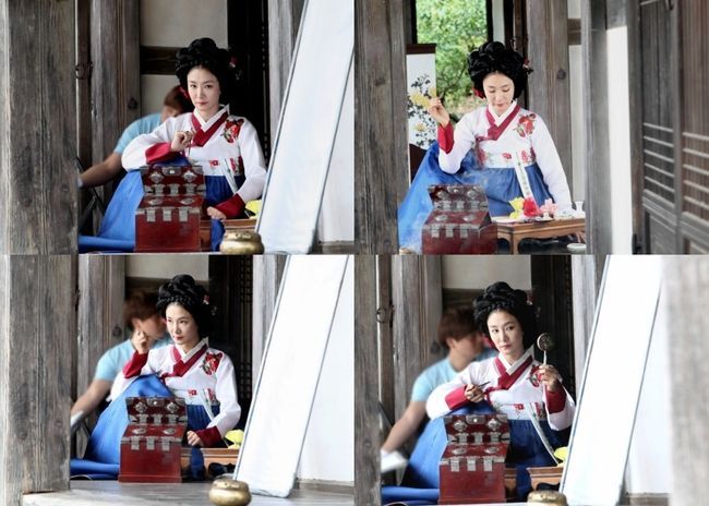 5일 소속사 열음엔터테인먼트는 SBS 월화드라마 '비밀의 문'에서 조선시대 부용재 행수 운심 역을 맡은 박효주의 촬영 현장 비하인드 사진을 공개했다.