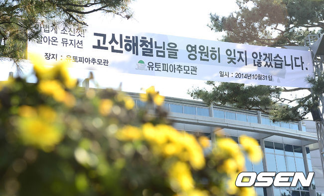 기자회견전 추모관 앞에 故신해철의 명복을 비는 현수막이 걸려 있다.