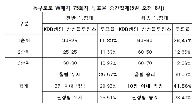 최종 KDB생명 60점대-삼성블루밍스 60점대 26.47%로 최다 집계…6일 오후 6시 50분 마감