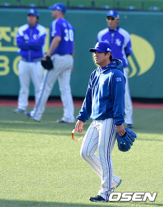 5일 오후 대구야구장에서 열린 2014 한국야쿠르트 세븐 프로야구 포스트시즌 한국시리즈 2차전, 경기에 앞서 삼성 안지만이 외야에서 훈련을 마치고 더그아웃으로 향하고 있다.