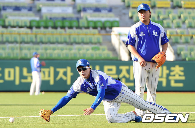 5일 오후 대구야구장에서 열리는 '2014 한국야쿠르트 세븐 프로야구' 포스트시즌 한국시리즈 2차전을 앞두고, 삼성 이승엽과 박석민이 수비 훈련을 하고 있다.