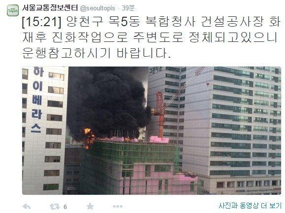 이어 서울교통정보센터는 “양천구 목5동 복합청사 건설공사장 화재 후 진화작업은 끝났으나, 마무리작업을 하고 있습니다. 도로통제는 없으나 주변도로 정체되고 있으니 참고운행 바랍니다”라고 소식을 전했다.