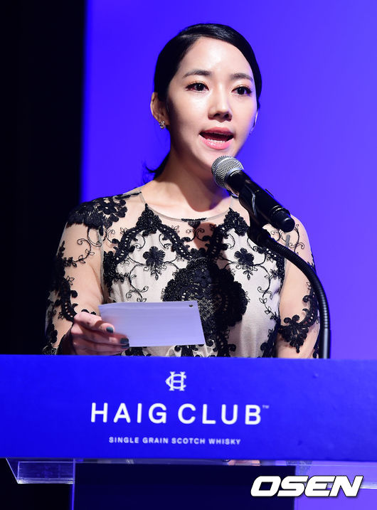 이윤진 아나운서가 5일 오후 서울 한남동 그랜드 하얏트 서울에서 열린 '디아지오 코리아 헤이그클럽(위스키)' 기자간담회에 참석해 인사말을 하고 있다.