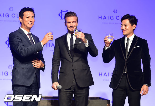 데이비드 베컴이 5일 오후 서울 한남동 그랜드 하얏트 서울에서 열린 '디아지오 코리아 헤이그클럽(위스키)' 기자간담회에 참석해 디아지오코리아 조길수 대표와 이서진과 시음 건배제의를 하고 있다.
