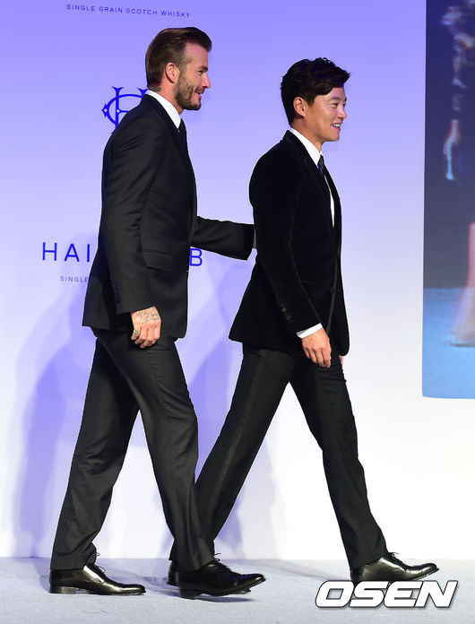 데이비드 베컴과 이서진이 5일 오후 서울 한남동 그랜드 하얏트 서울에서 열린 '디아지오 코리아 헤이그클럽(위스키)' 기자간담회 장소를 빠져나가고 있다.