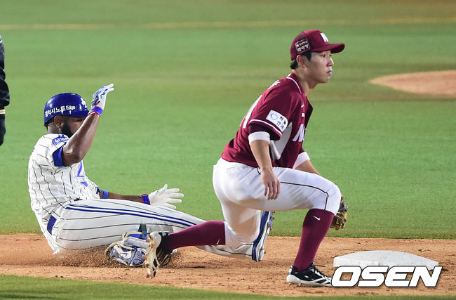 1회말 삼성 공격 선두타자로 나선 나바로가 좌중간 2루타를 날리고 2루에 세이프 되고 있다.