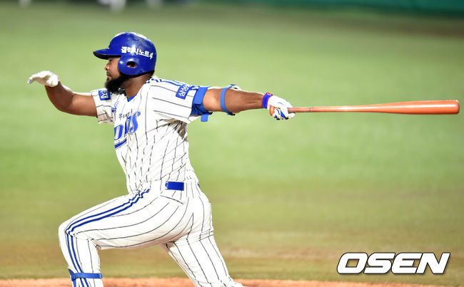 5일 오후 대구야구장에서 열린 2014 한국야쿠르트 세븐 프로야구 포스트시즌 한국시리즈 2차전, 1회말 선두타자 나바로가 2루타를 치고 있다.
