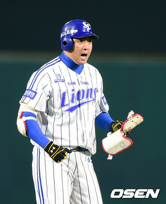 5일 오후 대구야구장에서 열린 2014 한국야쿠르트 세븐 프로야구 포스트시즌 한국시리즈 2차전, 1회초 1사 3루에서 삼성 채태인이 선취 1타점 적시 2루타를 날리고 기뻐하고 있다.