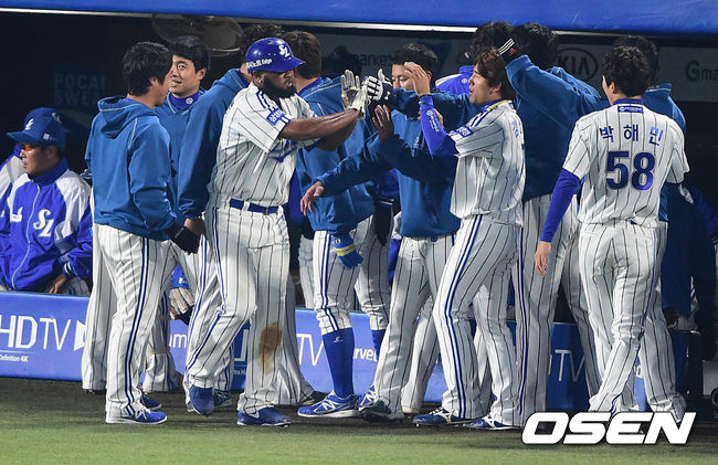 1회말 삼성 공격 1사 3루 상황 채태인의 선제 1타점 좌중간 2루타 때 홈을 밟은 나바로가 더그아웃 동료들과 인사를 나누고 있다.