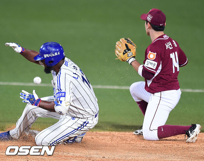 5일 오후 대구야구장에서 열린 2014 한국야쿠르트 세븐 프로야구 포스트시즌 한국시리즈 2차전, 1회말 삼성 선두타자 나바로가 2루타를 날리고 2루에 세이프되고 있다