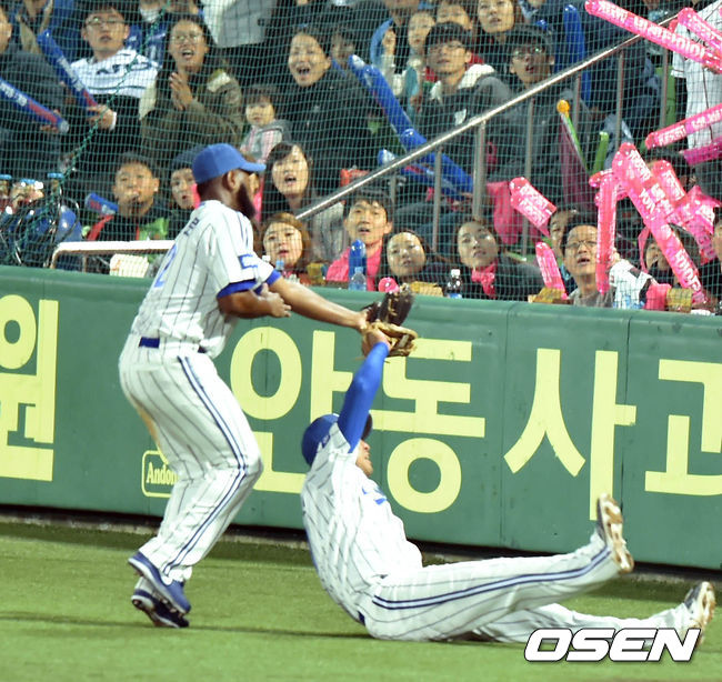 5일 오후 대구야구장에서 열린 2014 한국야쿠르트 세븐 프로야구 포스트시즌 한국시리즈 2차전, 2회초 강정호의 파울타구를 채태인이 넘어지며 잡아내고 있다.