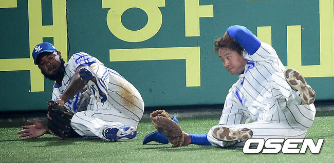 2회초 넥센 공격 1사 주자없는 상황 깅정호의 파울플라이 때 삼성 1루수 채태인과 2루수 나바로가 타구를 잡으며 넘어지고 있다.