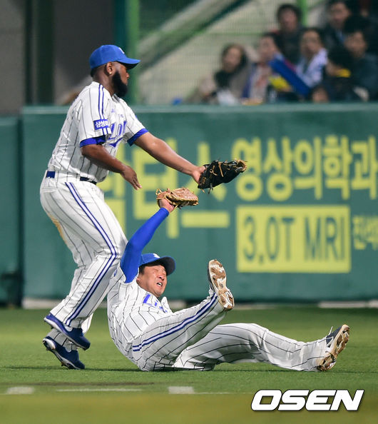 5일 오후 대구야구장에서 열린 2014 한국야쿠르트 세븐 프로야구 포스트시즌 한국시리즈 2차전, 2회초 넥센 공격 1사 주자없는 상황 깅정호의 파울플라이 때 삼성 1루수 채태인과 2루수 나바로가 타구를 잡으며 넘어지고 있다.