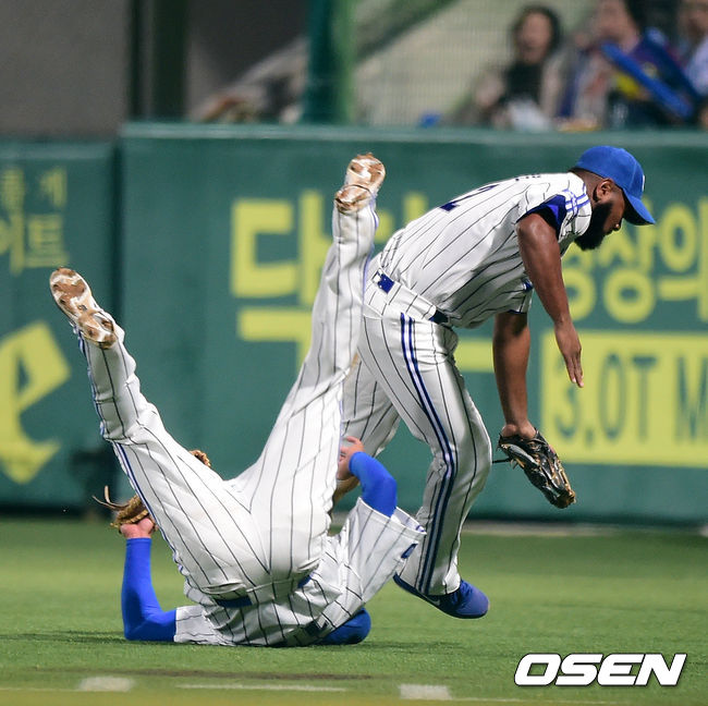 5일 오후 대구야구장에서 열린 2014 한국야쿠르트 세븐 프로야구 포스트시즌 한국시리즈 2차전, 2회초 넥센 공격 1사 주자없는 상황 깅정호의 파울플라이 때 삼성 1루수 채태인과 2루수 나바로가 타구를 잡으며 넘어지고 있다.