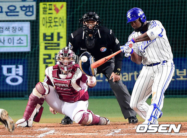 2회말 삼성 공격 2사 2루 상황 나바로가 좌중간 투런포를 날리고 있다.
