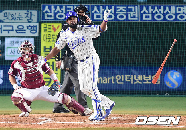 2회말 삼성 공격 2사 2루 상황 나바로가 좌중간 투런포를 날리고 배트를 던지고 있다.