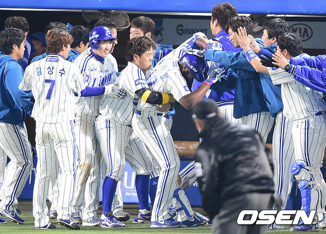 2회말 삼성 공격 2사 2루 상황 나바로가 좌중간 투런포를 날리고 홈을 밟은 뒤 박석민을 비롯한 더그아웃 동료들과 인사를 나누고 있다.