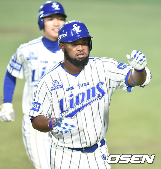 5일 오후 대구야구장에서 열린 2014 한국야쿠르트 세븐 프로야구 포스트시즌 한국시리즈 2차전, 2회말 2사 3루 나바로가 투런 홈런을 치고 베이스를 돌고 있다.