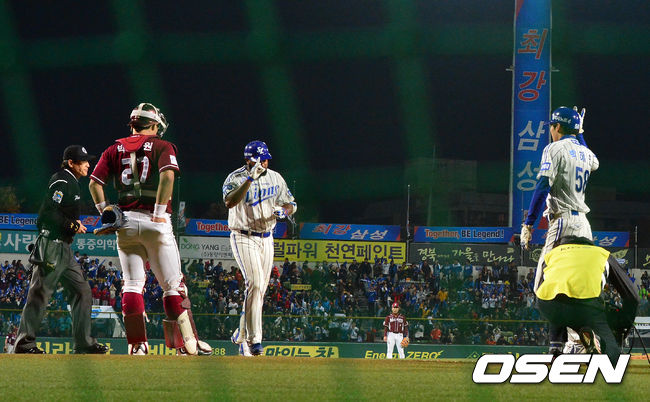 5일 오후 대구야구장에서 열린 2014 한국야쿠르트 세븐 프로야구 포스트시즌 한국시리즈 2차전, 2회말 삼성 공격 2사 2루 상황 나바로가 좌중간 투런포를 날리고 타구를 바라보고 있다.