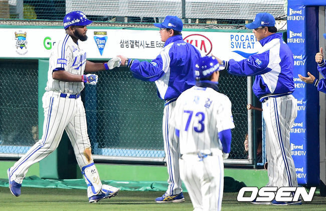 2회말 삼성 공격 2사 2루 상황 나바로가 좌중간 투런포를 날리고 류중일 감독과 인사를 나누고 있다.