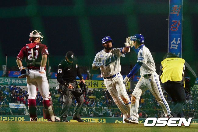 5일 오후 대구야구장에서 열린 2014 한국야쿠르트 세븐 프로야구 포스트시즌 한국시리즈 2차전, 2회말 삼성 공격 2사 2루 상황 나바로가 좌중간 투런포를 날리고 박해민과 하이파이브를 하고 있다.