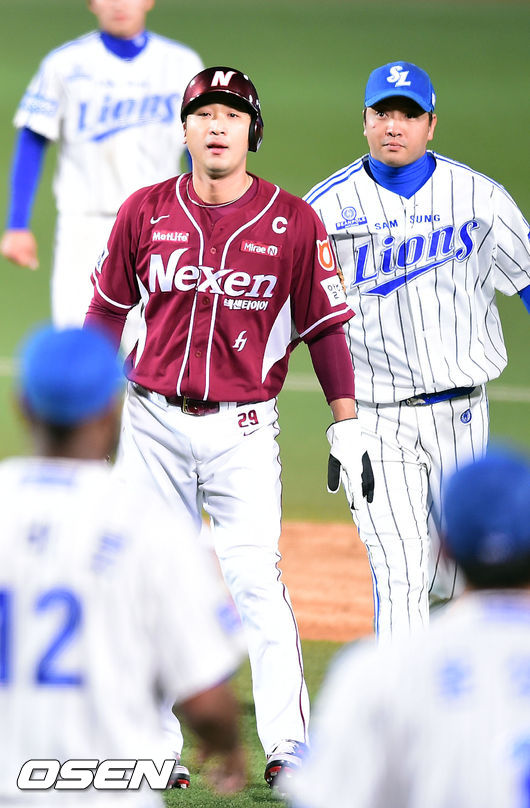 5일 오후 대구야구장에서 열린 2014 한국야쿠르트 세븐 프로야구 포스트시즌 한국시리즈 2차전, 3회초 무사 1루 넥센 이성열의 라인드라이브 타구에 협살 걸린 1루 주자 이택근이 태그아웃된뒤 아쉬워하고 있다