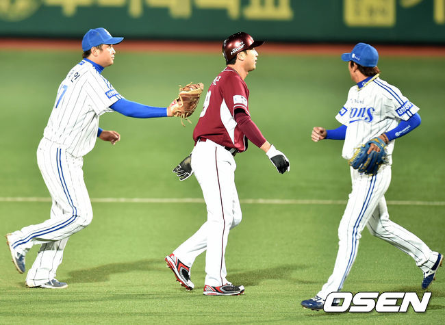 5일 오후 대구야구장에서 열린 2014 한국야쿠르트 세븐 프로야구 포스트시즌 한국시리즈 2차전, 3회초 무사 1루 이성열의 내야땅볼때 협살에 걸린 이택근이 태그아웃 되고 있다.