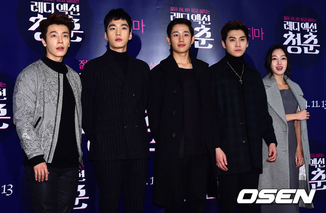 5일 오후 서울 롯데시네마 건대입구에서 열린 영화 '레디액션 청춘' VIP 시사회에서 동해(왼쪽부터), 구원, 정해인, 송승현, 서은아가 포토타임을 갖고 있다.